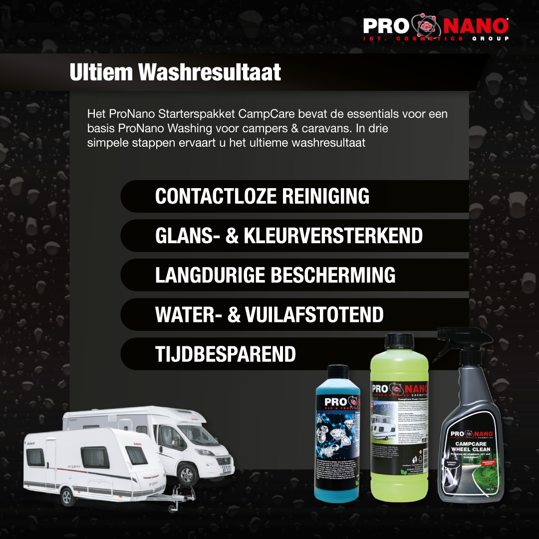 Skift nemt til kontaktløs rengøring; ProNano CampCare Starter Pack indeholder det essentielle til en grundlæggende ProNano Wash til autocampere og campingvogne. I tre enkle trin oplever du de ultimative vaskeresultater. Kom i gang med det samme!