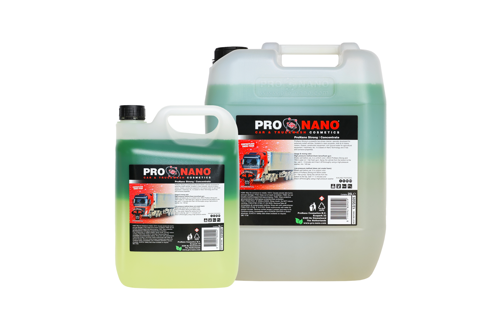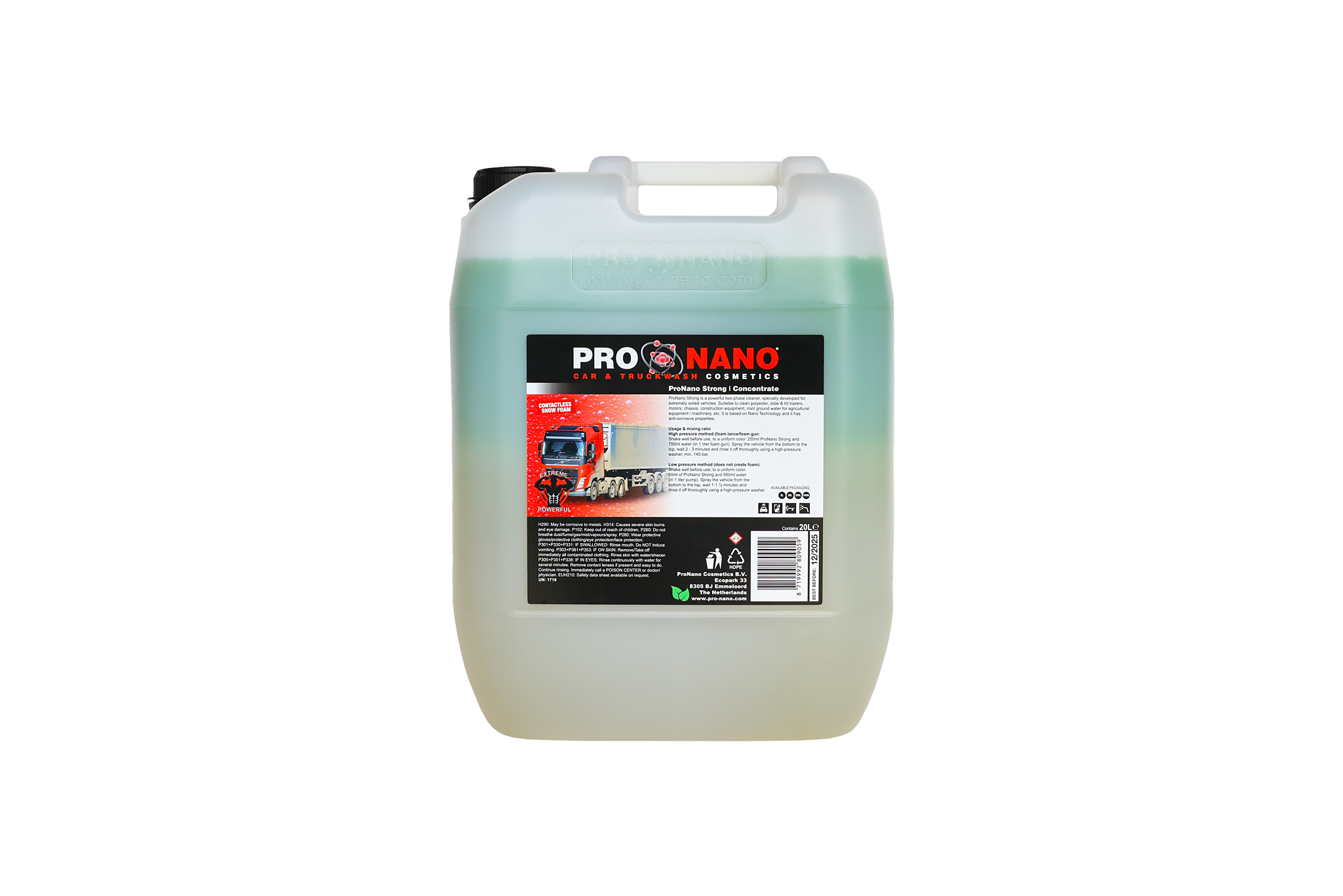 ProNano Strong es un potente limpiador bifásico, desarrollado para vehículos extremadamente sucios. Es apto para la limpieza a fondo de poliéster, remolques deslizantes y basculantes, motores, chasis y maquinaria de construcción. Durante el lavado, crea una espuma espesa y estable que adhiere eficazmente la suciedad al champú para coches y facilita su enjuague.