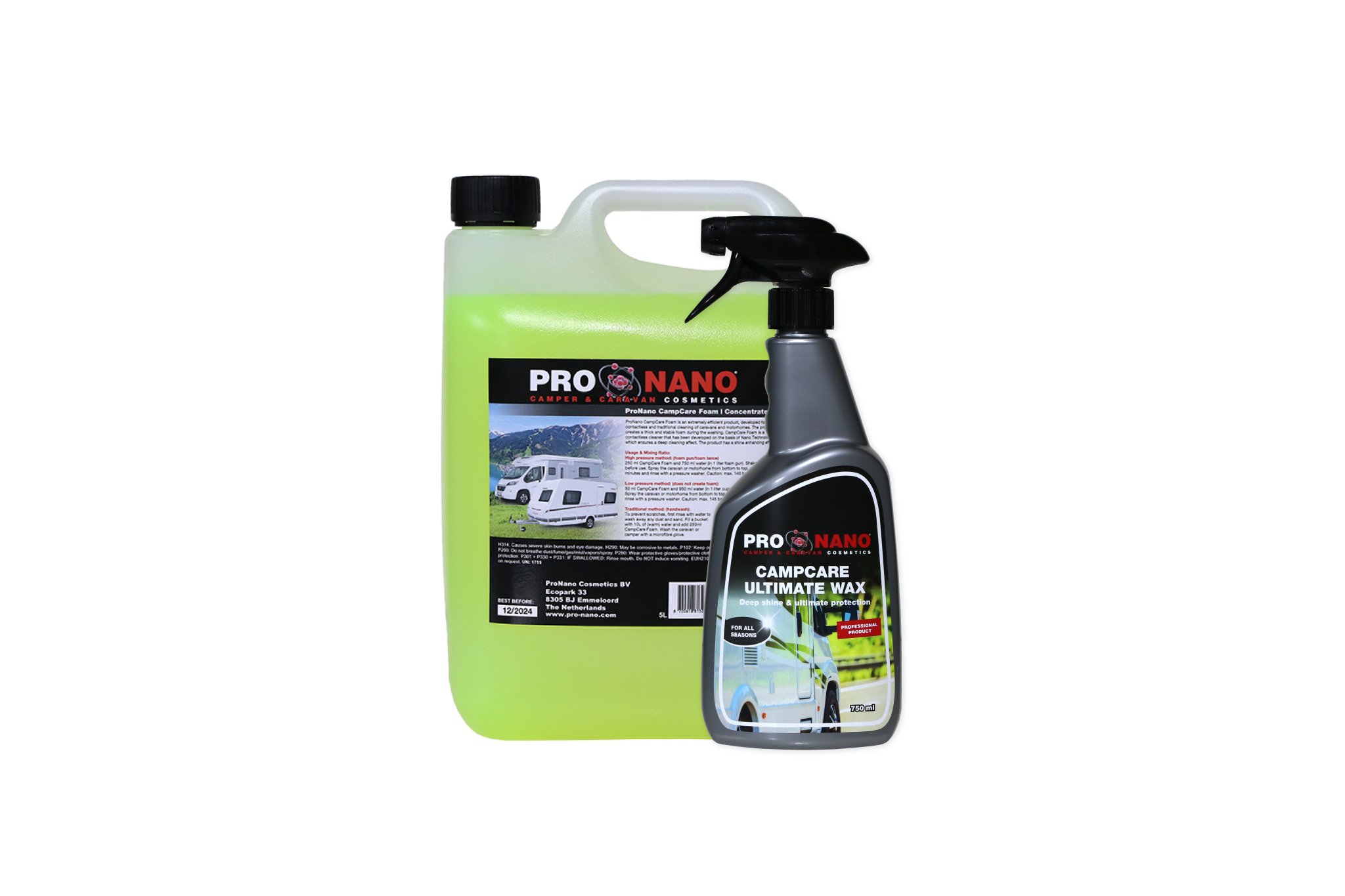 Ervaar een ongeëvenaarde resultaat met deze EXCLUSIEVE deal! De ProNano CampCare Foam is een hoogwaardige contactloze reiniger geschikt voor campers en caravans. Door de foam aan te brengen volgens de schuimmethode is uw voertuig binnen een mum van tijd weer diep gereinigd, en dat geheel contactloos! Geef uw camper of caravan vervolgens een hoogglans finish met de ProNano Ultimate Wax! Deze hoogwaardige wax brengt niet alleen cosmetische voordelen, maar zal uw voertuig ook beschermen tegen alle weersomstandigheden!