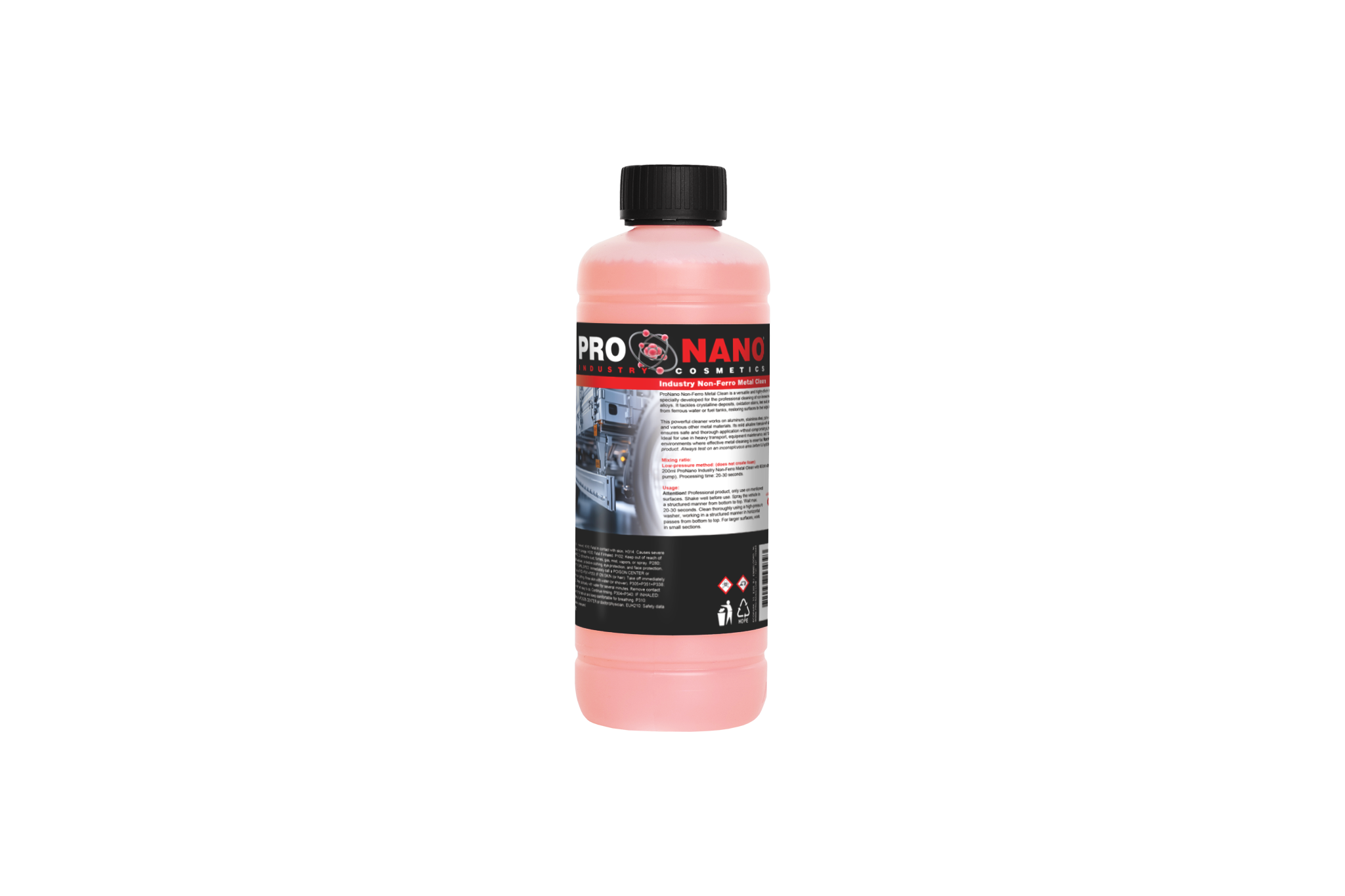 200 ml ProNano Industry Non-Ferro Metal Clean met 800 ml water (in 1L pomp). Inwerktijd: 20-30 seconden.