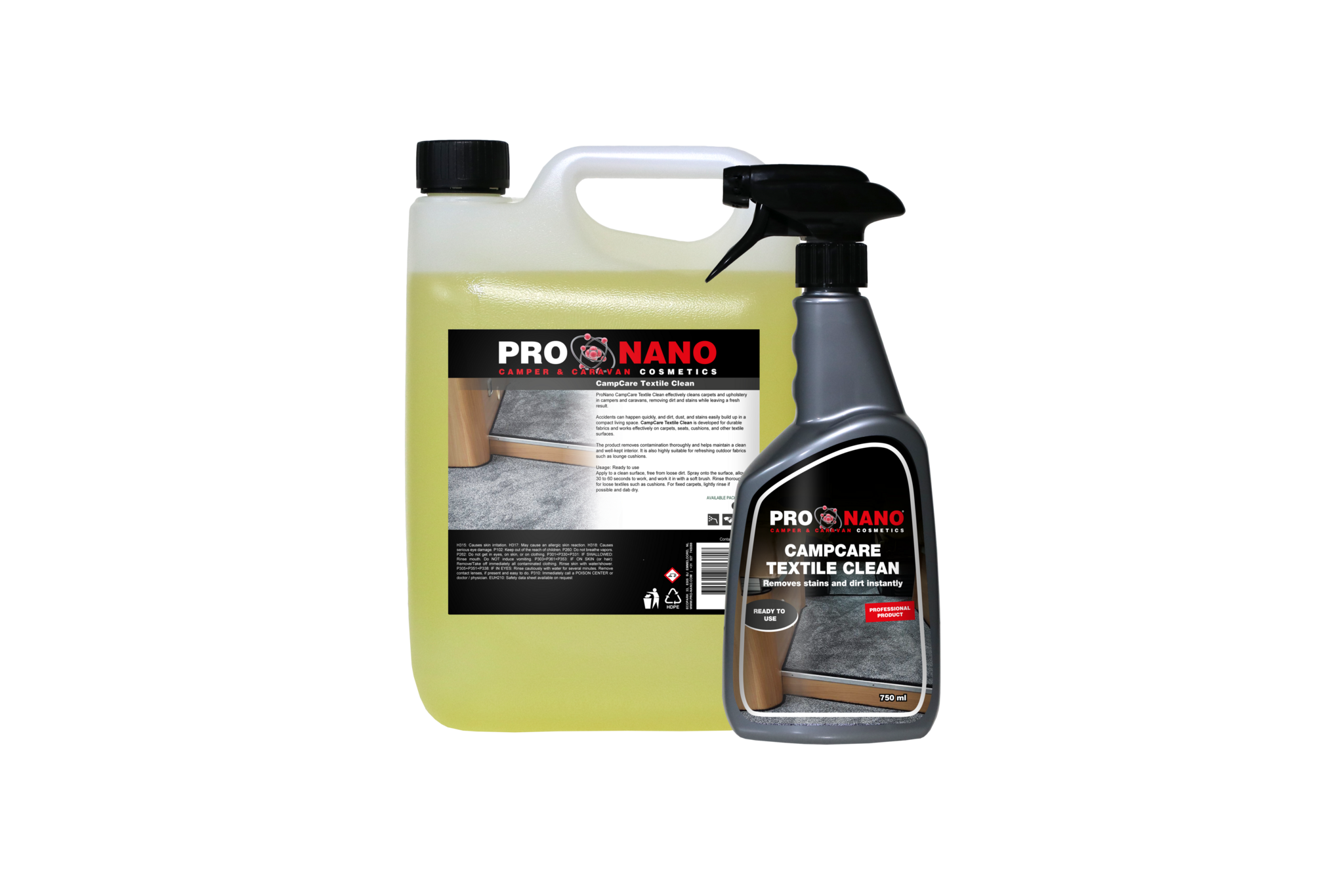 ProNano CampCare Textiel Clean is een product speciaal ontwikkeld voor het reinigen van tapijt en stevig textiel in campers of caravans. Het product is gebruiksklaar en reinigt vuil en vlekken van textiel.